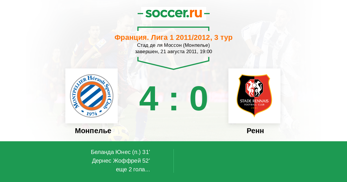 Франция. Лига 1 05.03.2011 Монпелье Логотип футбольный клуб Монпелье 0:1 Логотип футбольный клуб Ренн Ренн