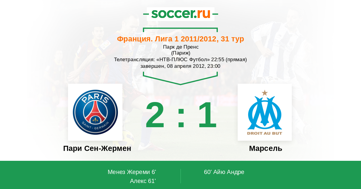Франция. Лига 1 28.11.2011 Марсель Логотип футбольный клуб Марсель 3:0 Логотип футбольный клуб Пари Сен-Жермен (Париж) Пари Сен-Жермен