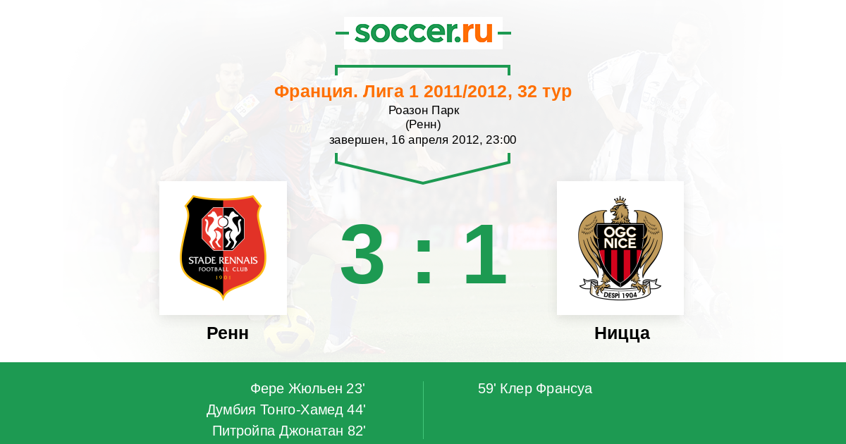Франция. Лига 1 04.12.2011 Ницца Логотип футбольный клуб Ницца 2:0 Логотип футбольный клуб Ренн Ренн