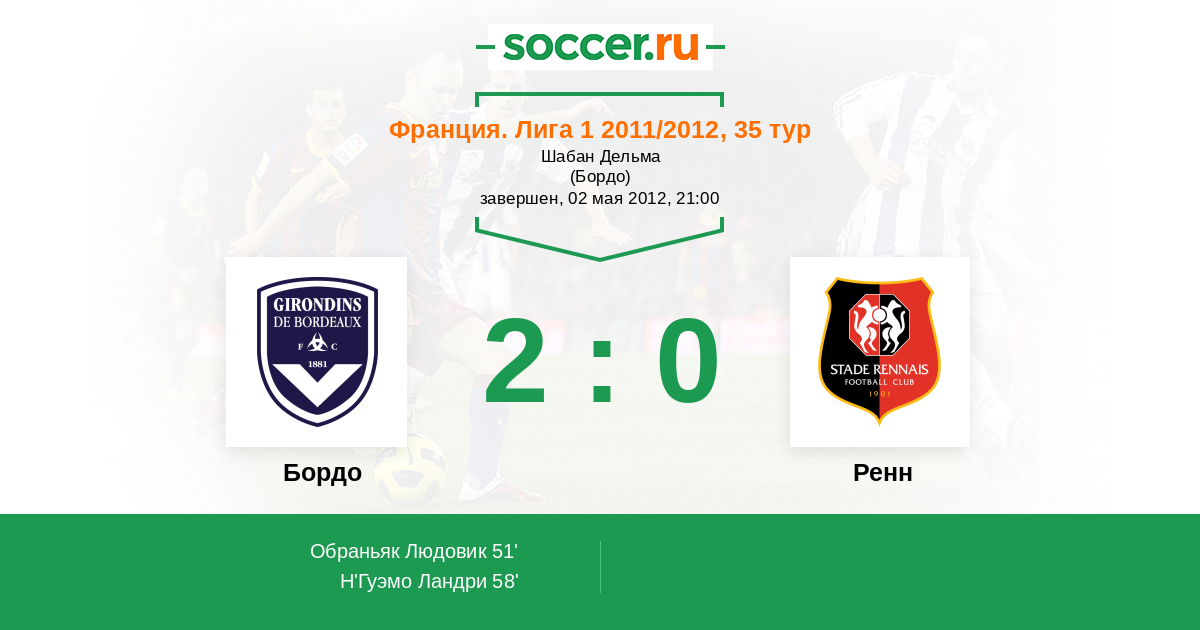 Франция. Лига 1 21.12.2011 Ренн Логотип футбольный клуб Ренн 1:0 Логотип футбольный клуб Бордо Бордо