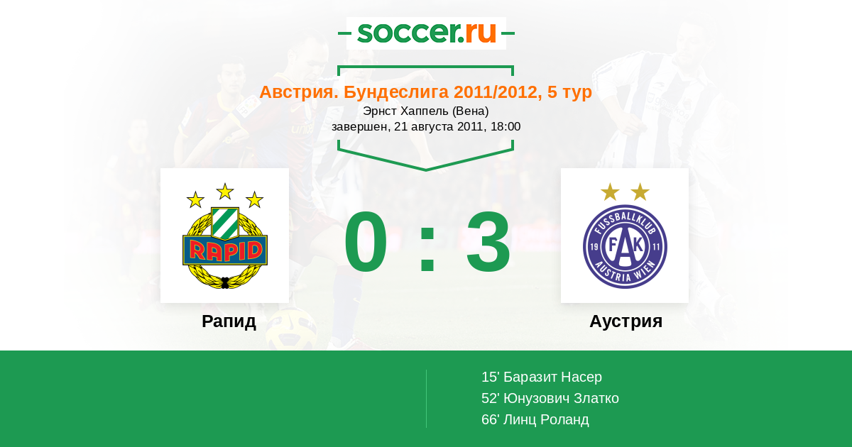 Австрия. Бундеслига 05.08.2012 Рапид Логотип футбольный клуб Рапид (Вена) 0:3 Логотип футбольный клуб Аустрия (Вена) Аустрия