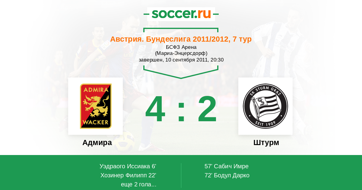 Австрия. Бундеслига 25.08.2012 Штурм Логотип футбольный клуб Штурм (Грац) 3:2 Логотип футбольный клуб Адмира (Мёдлинг) Адмира