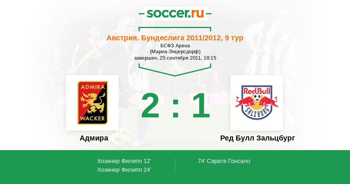 Австрия. Бундеслига 24.03.2012 Адмира Логотип футбольный клуб Адмира (Мёдлинг) 2:2 Логотип футбольный клуб Ред Булл Зальцбург Ред Булл Зальцбург