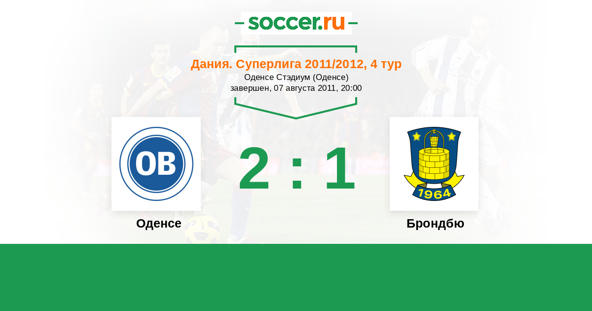 Дания. Суперлига 01.04.2012 Брондбю Логотип футбольный клуб Брондбю (Брённбю) 1:0 Логотип футбольный клуб Оденсе Оденсе
