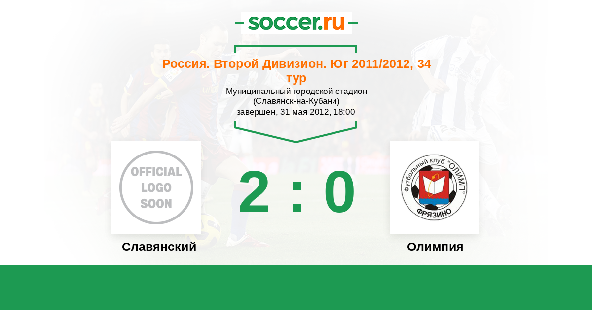 Россия. Вторая лига. Группа 1 31.05.2012 Славянский Логотип футбольный клуб Славянский (Славянск-на-Кубани) 2:0 Логотип футбольный клуб Олимпия (Геленджик) Олимпия