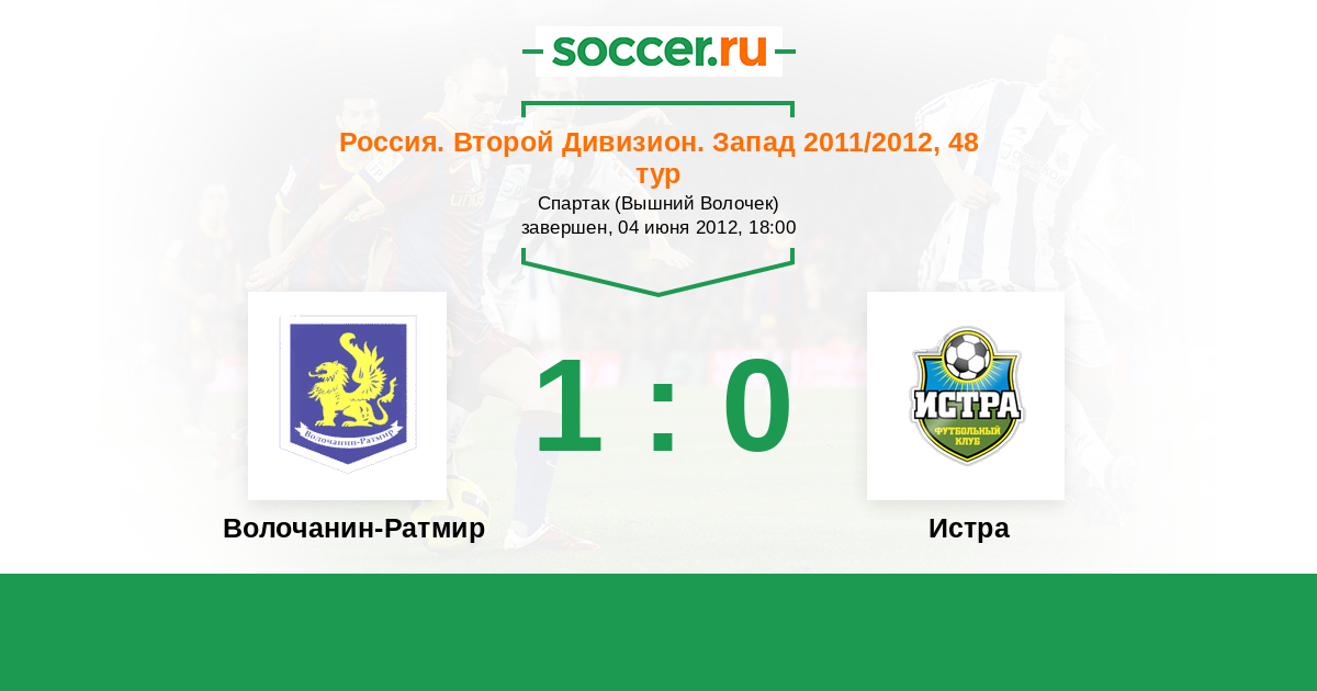 Россия. Вторая лига. Группа 2 04.06.2012 Волочанин-Ратмир Логотип футбольный клуб Волочанин-Ратмир (Вышний Волочек) 1:0 Логотип футбольный клуб Истра Истра