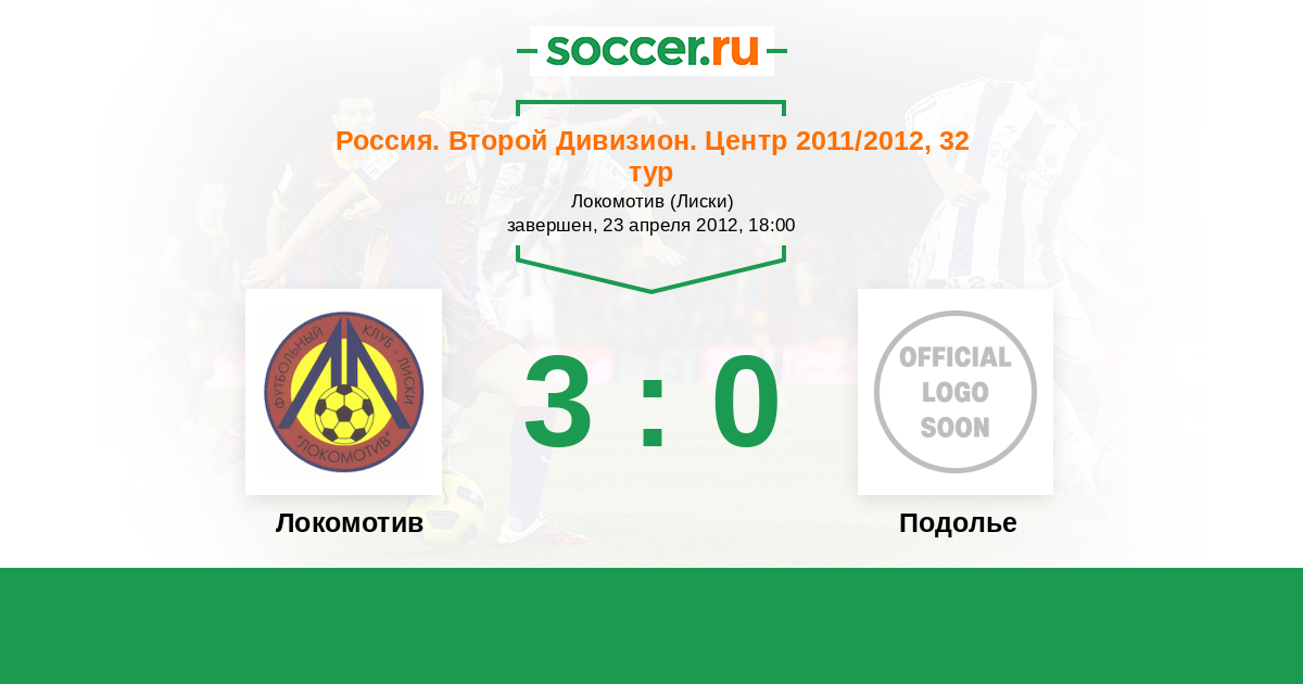 Россия. Вторая лига. Группа 3 15.04.2014 Подолье Логотип футбольный клуб Подолье (Подольский район) 1:0 Логотип футбольный клуб Локомотив (Лиски) Локомотив