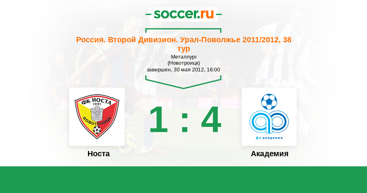 Россия. Вторая лига. Группа 4 30.06.2011 Носта Логотип футбольный клуб Носта (Новотроицк) 1:1 Логотип футбольный клуб Академия (Тольятти) Академия