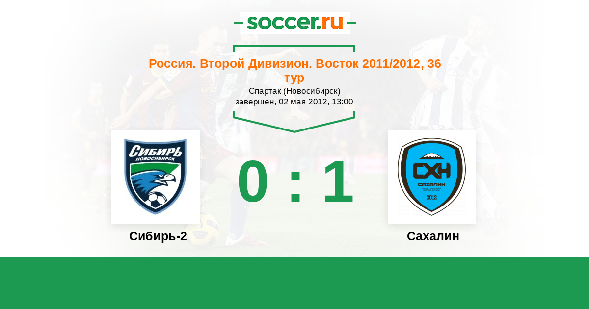 Россия. 2-й дивизион. Восток 29.05.2011 Сибирь-2 Логотип футбольный клуб Сибирь-2 (Новосибирск) 1:3 Логотип футбольный клуб Сахалин (Южно-Сахалинск) Сахалин