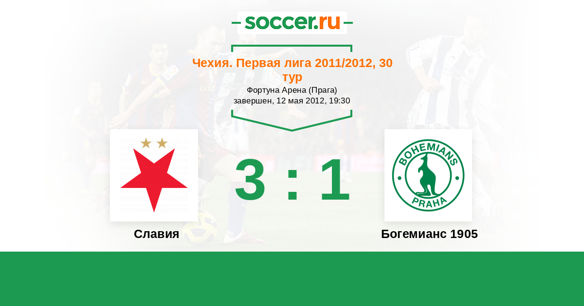 Чехия. Первая Лига 29.07.2011 Богемианс 1905 Логотип футбольный клуб Богемианс 1905 (Прага) 2:0 Логотип футбольный клуб Славия (Прага) Славия
