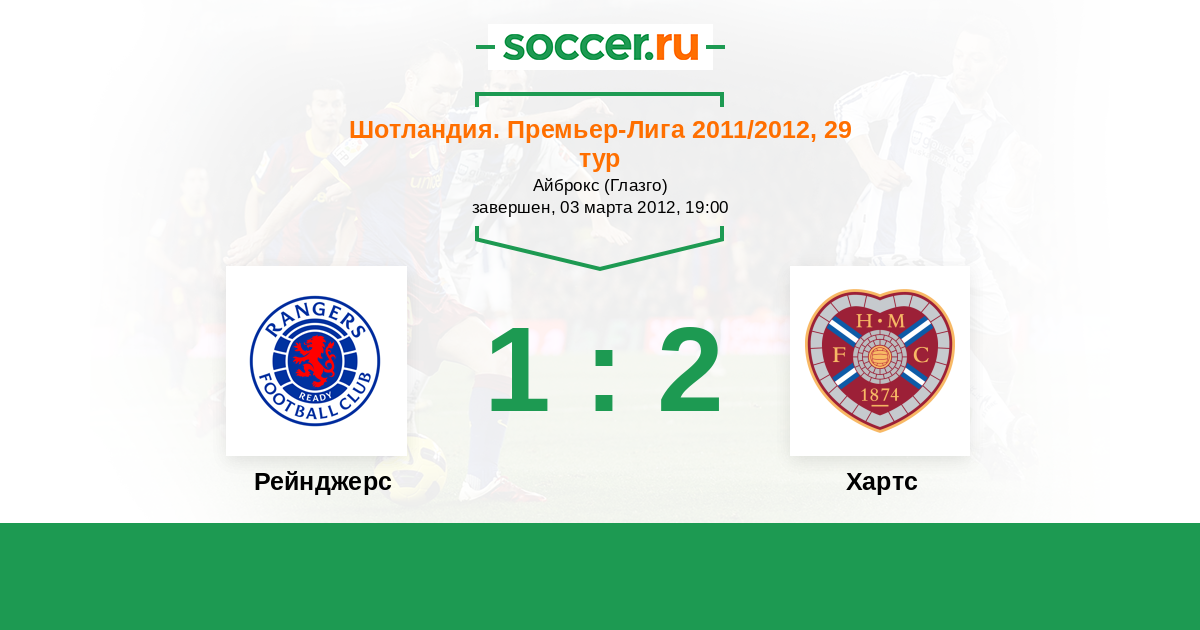Шотландия. Премьер-Лига 21.04.2012 Хартс Логотип футбольный клуб Хартс (Эдинбург) 0:3 Логотип футбольный клуб Рейнджерс (Глазго) Рейнджерс