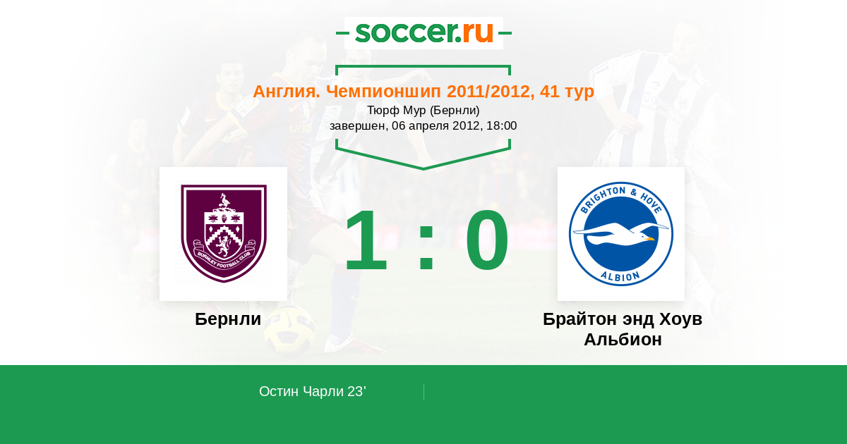 Англия. Чемпионшип 17.12.2011 Брайтон энд Хоув Альбион Логотип футбольный клуб Брайтон энд Хоув Альбион 0:1 Логотип футбольный клуб Бернли Бернли