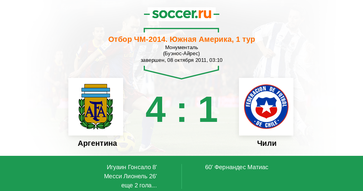 Отбор ЧМ. Южная Америка 17.10.2012 Чили Логотип Чили 1:2 Логотип Аргентина Аргентина