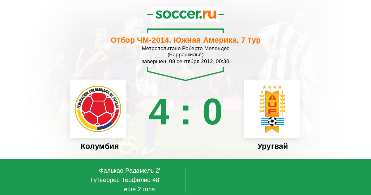 Отбор ЧМ. Южная Америка 11.09.2013 Уругвай Логотип Уругвай 2:0 Логотип Колумбия Колумбия