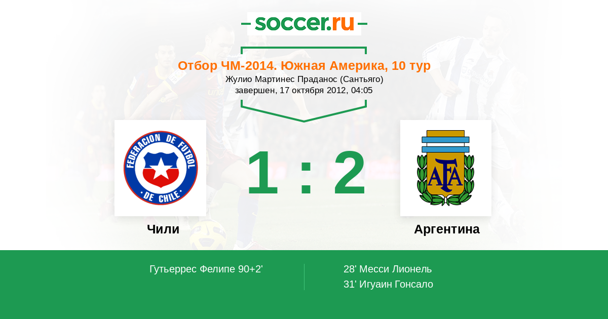 Отбор ЧМ. Южная Америка 08.10.2011 Аргентина Логотип Аргентина 4:1 Логотип Чили Чили