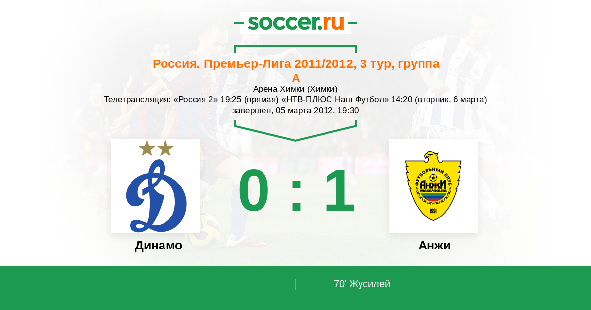 Россия. Премьер-Лига 07.10.2012 Динамо Логотип футбольный клуб Динамо (Москва) 0:2 Логотип футбольный клуб Анжи (Махачкала) Анжи