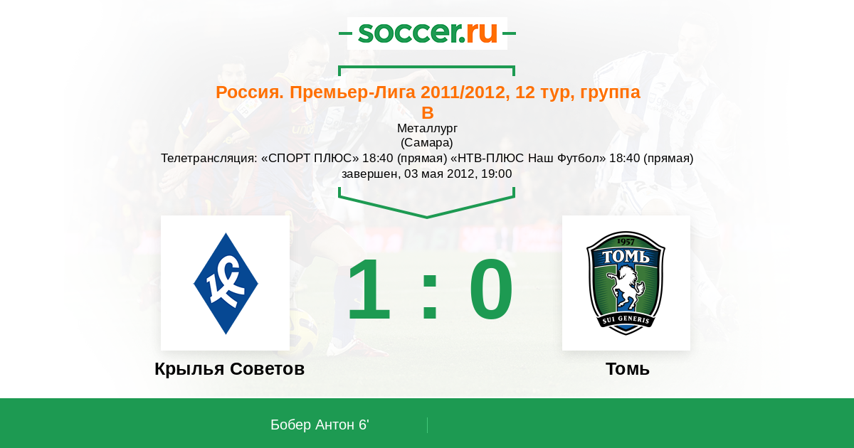 Россия. Премьер-Лига 24.03.2012 Томь Логотип футбольный клуб Томь (Томск) 0:0 Логотип футбольный клуб Крылья Советов (Самара) Крылья Советов