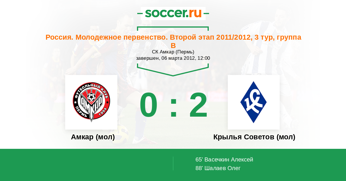 Россия. Премьер-Лига U21 01.04.2011 Амкар (мол) Логотип футбольный клуб Амкар (мол) (Пермь) 2:1 Логотип футбольный клуб Крылья Советов (мол) (Самара) Крылья Советов (мол)
