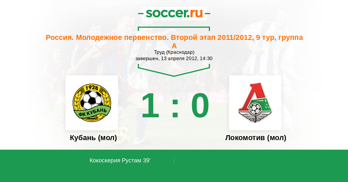 Россия. Премьер-Лига U21 29.04.2011 Локомотив (мол) Логотип футбольный клуб Локомотив (мол) (Москва) 2:0 Логотип футбольный клуб Кубань (мол) (Краснодар) Кубань (мол)