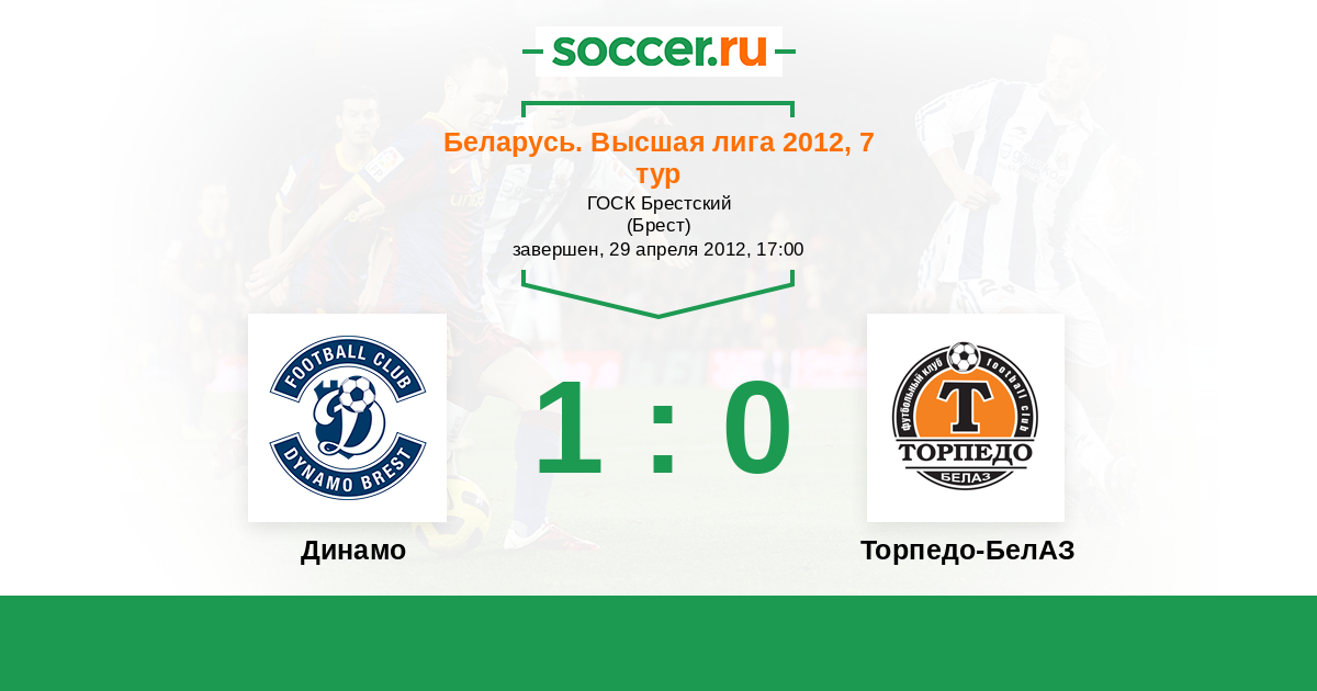 Беларусь. Высшая лига 07.07.2012 Торпедо-БелАЗ Логотип футбольный клуб Торпедо-БелАЗ (Жодино) 1:0 Логотип футбольный клуб Динамо (Брест) Динамо