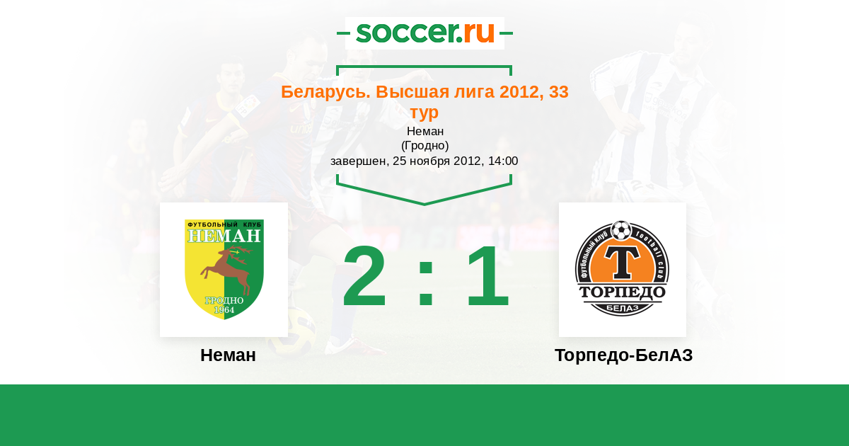 Беларусь. Высшая лига 12.08.2012 Торпедо-БелАЗ Логотип футбольный клуб Торпедо-БелАЗ (Жодино) 1:5 Логотип футбольный клуб Неман (Гродно) Неман