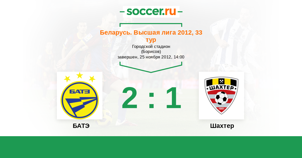Беларусь. Высшая лига 07.07.2012 Шахтер Логотип футбольный клуб Шахтер (Солигорск) 1:1 Логотип футбольный клуб БАТЭ (Борисов) БАТЭ