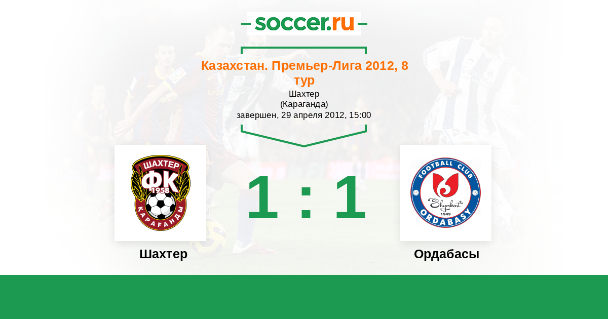 Казахстан. Премьер-лига 25.06.2011 Шахтер Логотип футбольный клуб Шахтер (Караганда) 2:2 Логотип футбольный клуб Ордабасы (Шымкент) Ордабасы