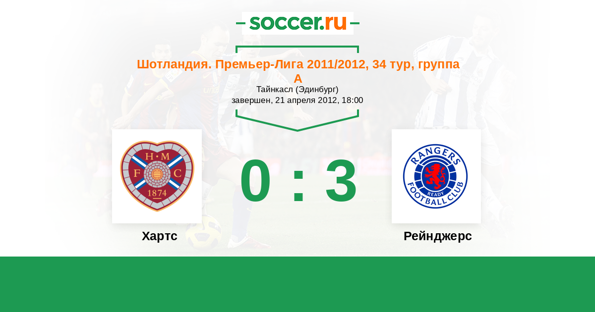 Шотландия. Премьер-Лига 03.03.2012 Рейнджерс Логотип футбольный клуб Рейнджерс (Глазго) 1:2 Логотип футбольный клуб Хартс (Эдинбург) Хартс