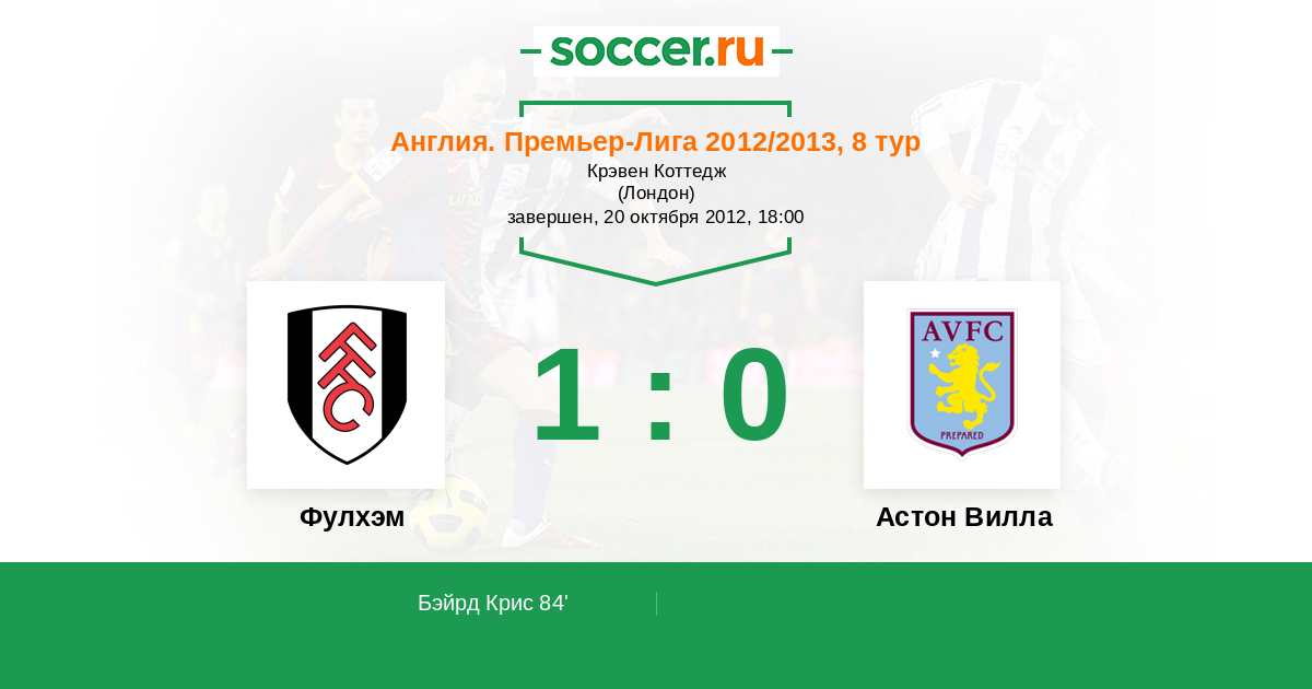 Англия. Премьер-Лига 13.04.2013 Астон Вилла Логотип футбольный клуб Астон Вилла (Бирмингем) 1:1 Логотип футбольный клуб Фулхэм (Лондон) Фулхэм