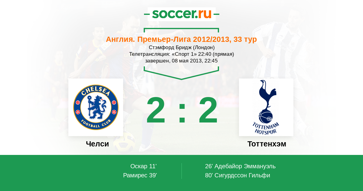 Англия. Премьер-Лига 02.05.2016 Челси Логотип футбольный клуб Челси (Лондон) 2:2 Логотип футбольный клуб Тоттенхэм (Лондон) Тоттенхэм