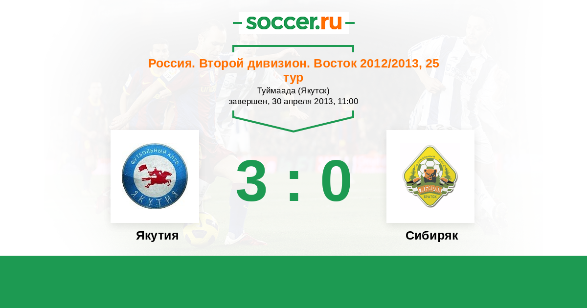 Россия. 2-й дивизион. Восток 19.09.2012 Сибиряк Логотип футбольный клуб Сибиряк (Братск) 2:0 Логотип футбольный клуб Якутия (Якутск) Якутия