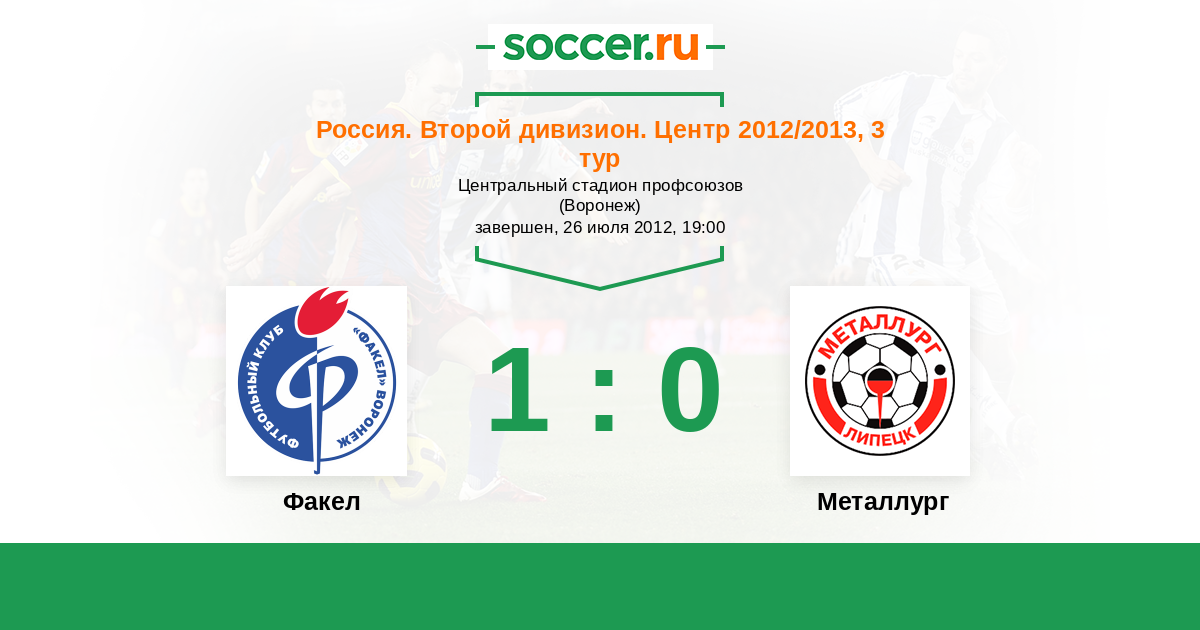 Россия. Вторая лига. Группа 3 17.10.2012 Металлург Логотип футбольный клуб Металлург (Липецк) 2:1 Логотип футбольный клуб Факел (Воронеж) Факел