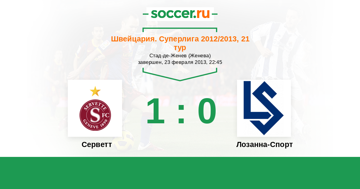 Швейцария. Суперлига 26.09.2012 Серветт Логотип футбольный клуб Серветт (Женева) 0:1 Логотип футбольный клуб Лозанна-Спорт Лозанна-Спорт