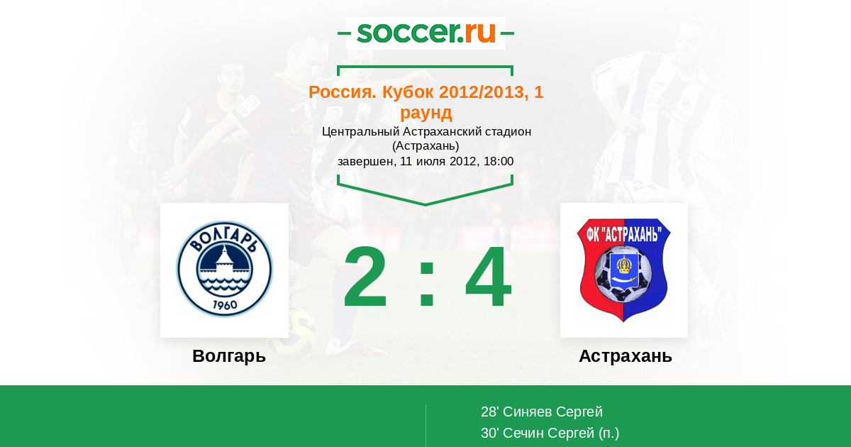 Россия. Вторая лига. Группа 1 21.07.2012 Волгарь Логотип футбольный клуб Волгарь (Астрахань) 1:3 Логотип футбольный клуб Астрахань Астрахань