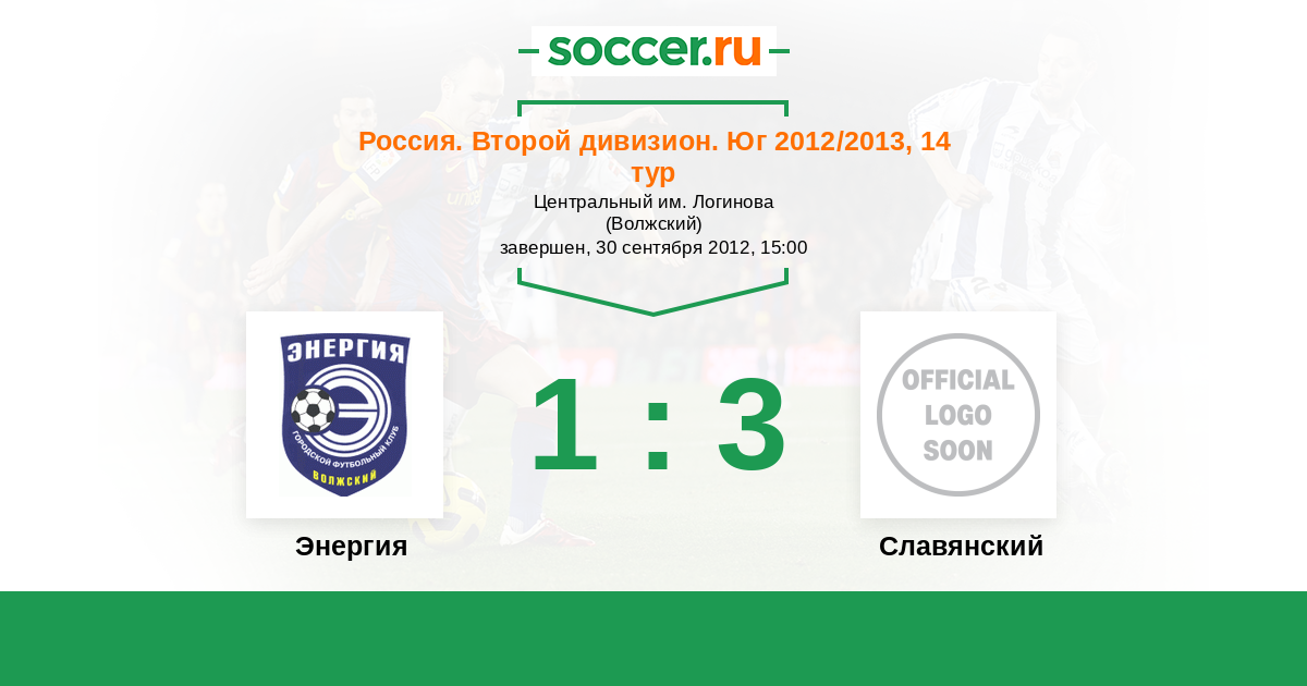 Россия. Вторая лига. Группа 1 16.05.2013 Славянский Логотип футбольный клуб Славянский (Славянск-на-Кубани) 1:1 Логотип футбольный клуб Энергия (Волжский) Энергия