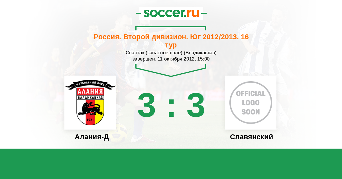 Россия. Вторая лига. Группа 1 14.08.2011 Славянский Логотип футбольный клуб Славянский (Славянск-на-Кубани) 2:1 Логотип футбольный клуб Алания-Д (Владикавказ) Алания-Д