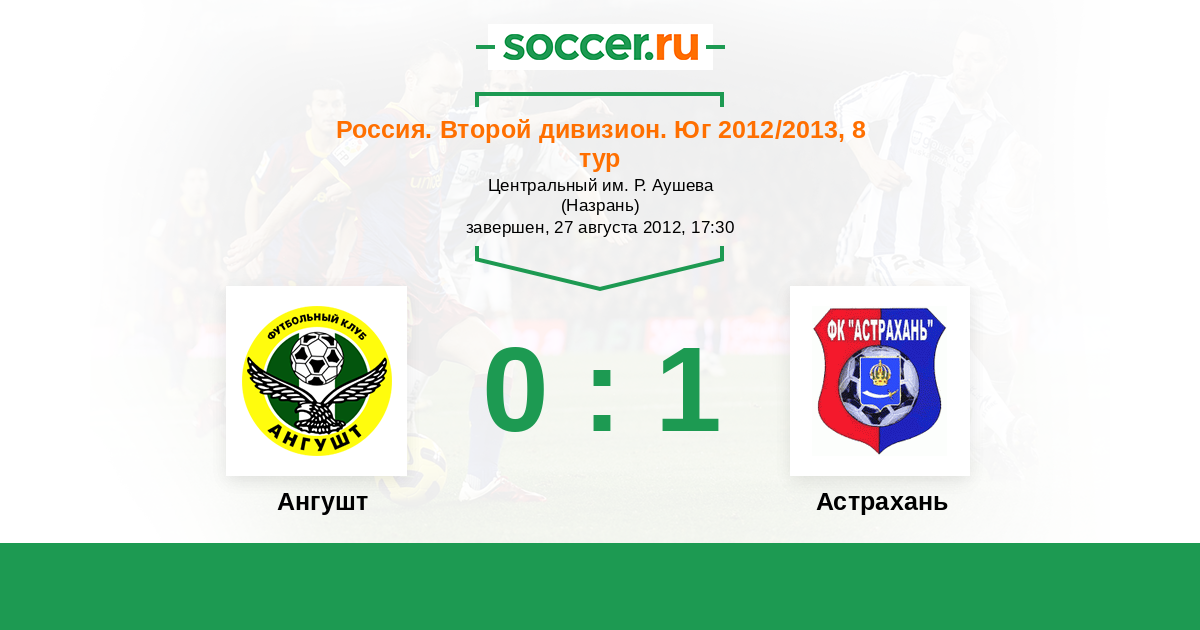 Россия. Вторая лига. Группа 1 13.08.2010 Астрахань Логотип футбольный клуб Астрахань 1:0 Логотип футбольный клуб Ангушт (Назрань) Ангушт