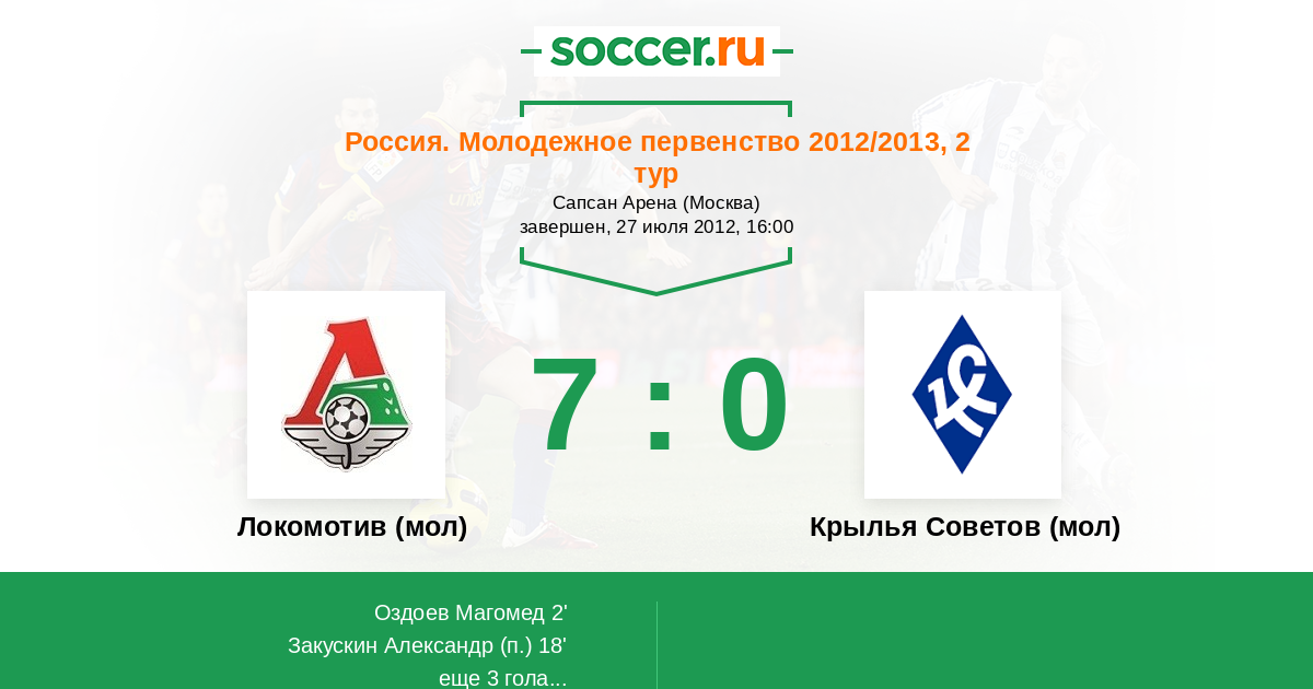 Россия. Премьер-Лига U21 06.08.2011 Локомотив (мол) Логотип футбольный клуб Локомотив (мол) (Москва) 2:0 Логотип футбольный клуб Крылья Советов (мол) (Самара) Крылья Советов (мол)