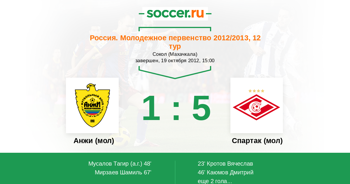 Россия. Премьер-Лига U21 27.04.2013 Спартак (мол) Логотип футбольный клуб Спартак (мол) (Москва) 1:0 Логотип футбольный клуб Анжи (мол) (Махачкала) Анжи (мол)