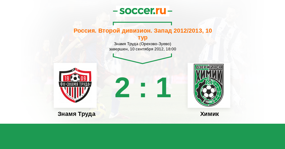Россия. Вторая лига. Группа 2 23.04.2013 Химик Логотип футбольный клуб Химик (Дзержинск) 2:0 Логотип футбольный клуб Знамя Труда (Орехово-Зуево) Знамя Труда