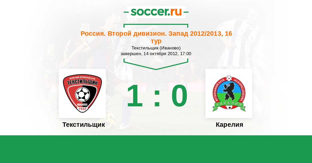 Россия. Вторая лига. Группа 2 03.10.2012 Карелия Логотип футбольный клуб Карелия (Петрозаводск) 0:1 Логотип футбольный клуб Текстильщик (Иваново) Текстильщик