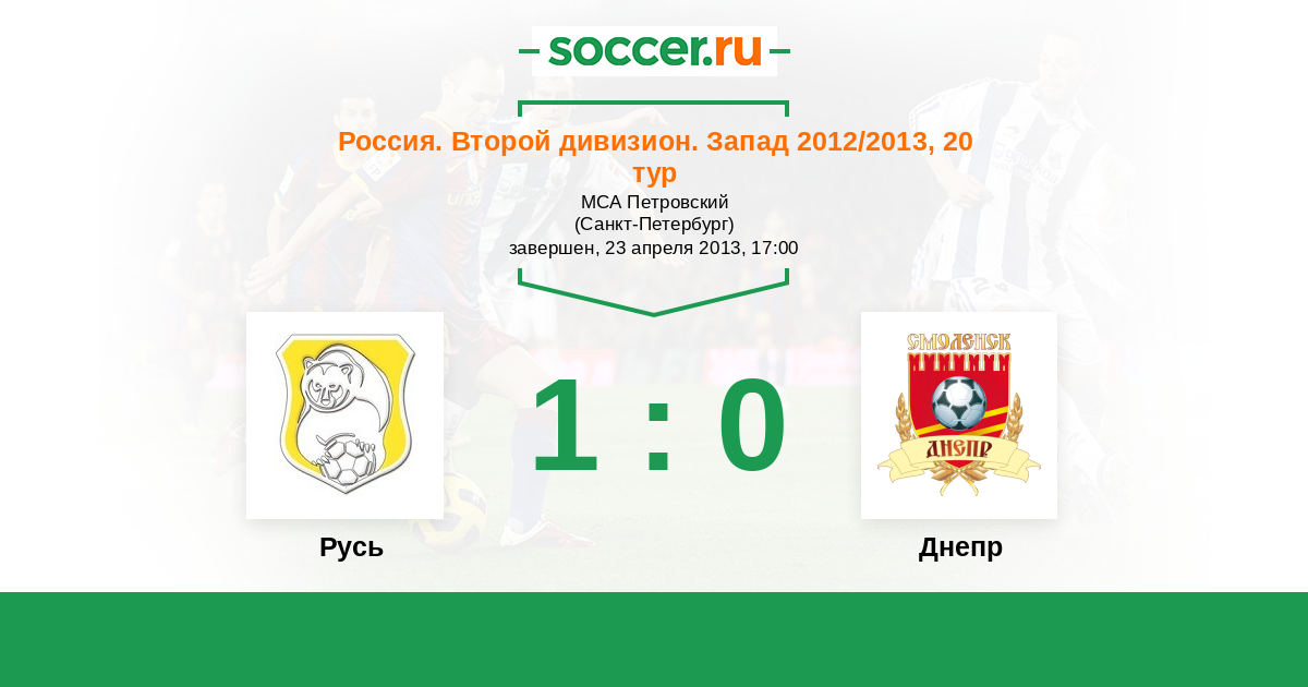 Россия. Вторая лига. Группа 2 10.09.2012 Днепр Логотип футбольный клуб Днепр (Смоленск) 1:0 Логотип футбольный клуб Русь (Санкт-Петербург) Русь