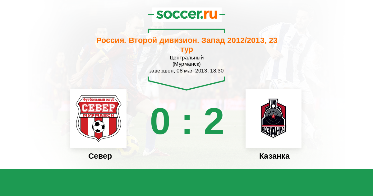 Россия. Вторая лига. Группа 2 24.05.2014 Север Логотип футбольный клуб Север (Мурманск) 0:0 Логотип футбольный клуб Знамя Труда (Орехово-Зуево) Знамя Труда