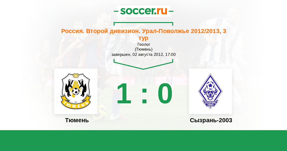 Россия. Вторая лига. Группа 4 01.08.2013 Сызрань-2003 Логотип футбольный клуб Сызрань-2003 1:2 Логотип футбольный клуб Тюмень Тюмень