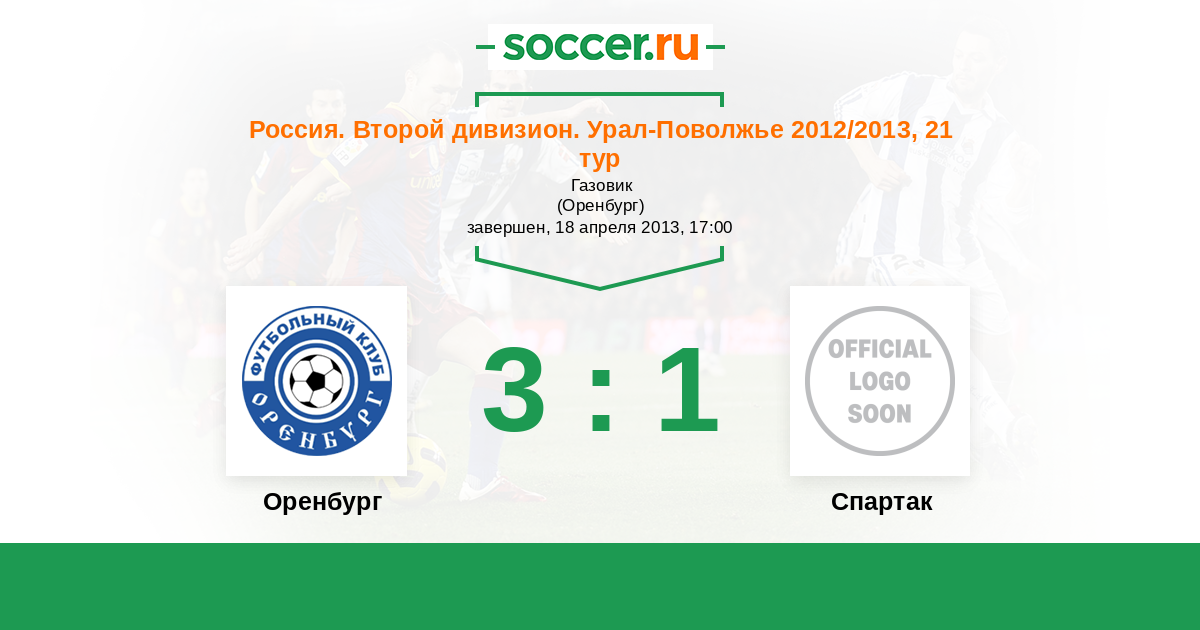 Россия. Вторая лига. Группа 4 14.08.2012 Спартак Логотип футбольный клуб Спартак (Йошкар-Ола) 0:1 Логотип футбольный клуб Газовик (Оренбург) Газовик