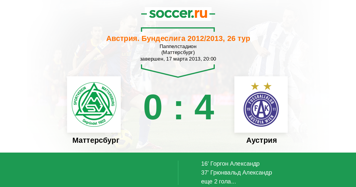 Австрия. Бундеслига 16.09.2012 Маттерсбург Логотип футбольный клуб Маттерсбург 2:4 Логотип футбольный клуб Аустрия (Вена) Аустрия