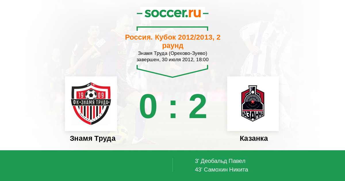 Россия. Вторая лига. Группа 2 23.07.2012 Знамя Труда Логотип футбольный клуб Знамя Труда (Орехово-Зуево) 2:1 Логотип футбольный клуб Локомотив-2 (Москва) Локомотив-2