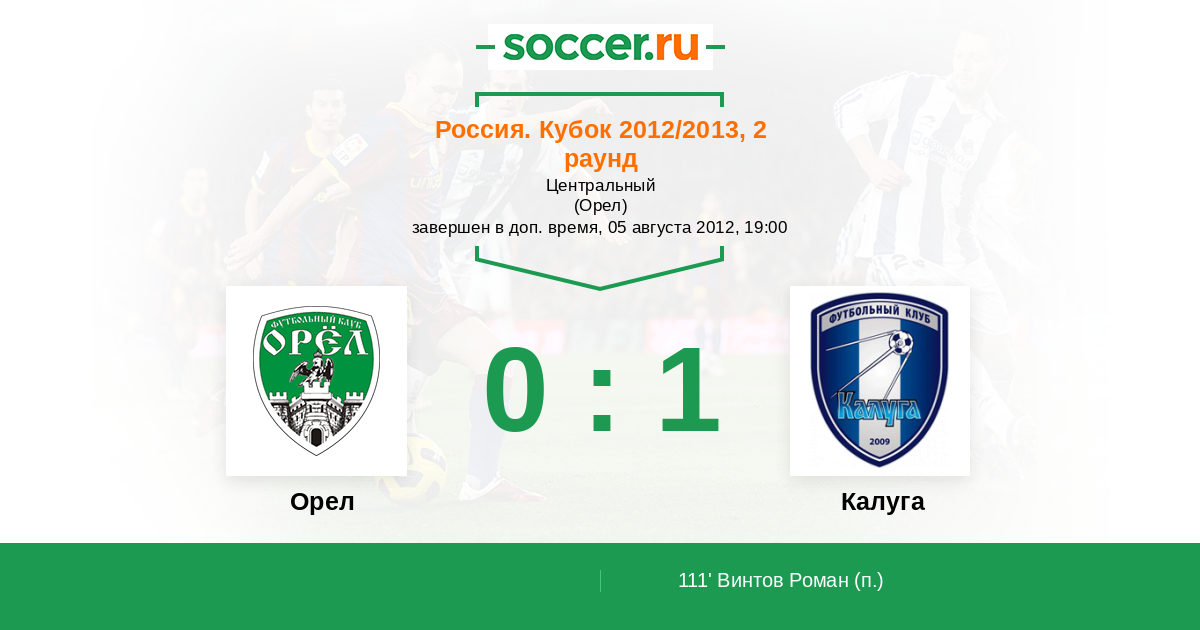 Россия. Вторая лига. Группа 3 09.08.2012 Калуга Логотип футбольный клуб Калуга 3:0 Логотип футбольный клуб Орел Орел