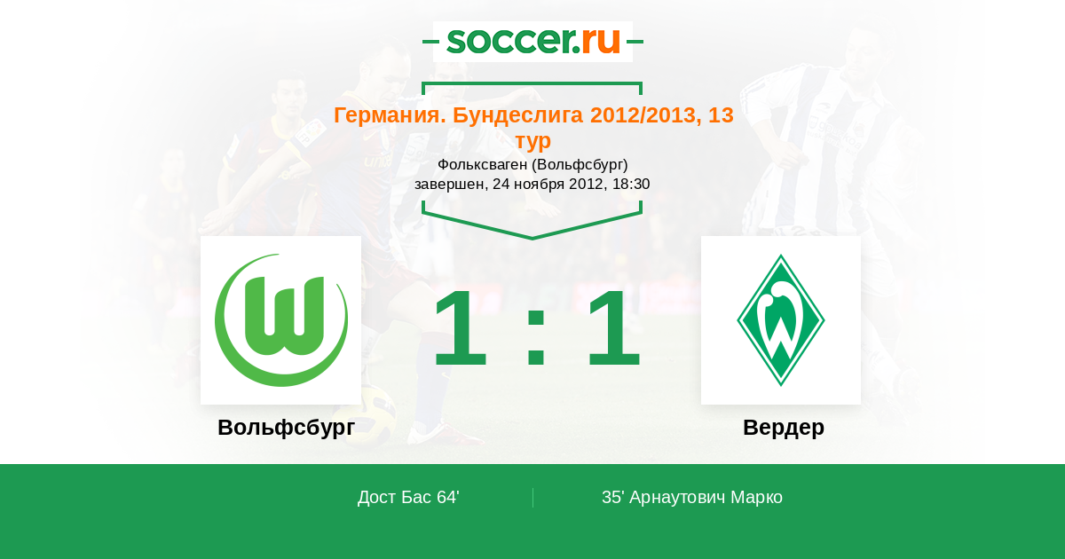 Германия. Бундеслига 20.04.2013 Вердер Логотип футбольный клуб Вердер (Бремен) 0:3 Логотип футбольный клуб Вольфсбург Вольфсбург