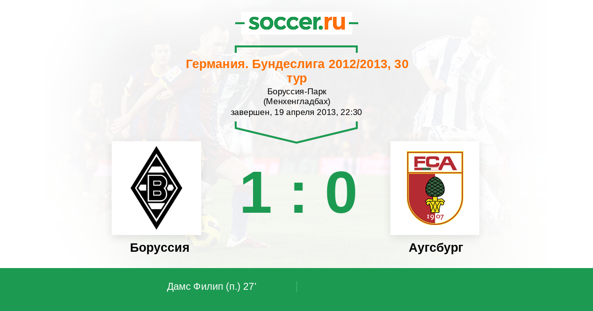 Германия. Бундеслига 28.04.2012 Боруссия Логотип футбольный клуб Боруссия (Менхенгладбах) 0:0 Логотип футбольный клуб Аугсбург Аугсбург